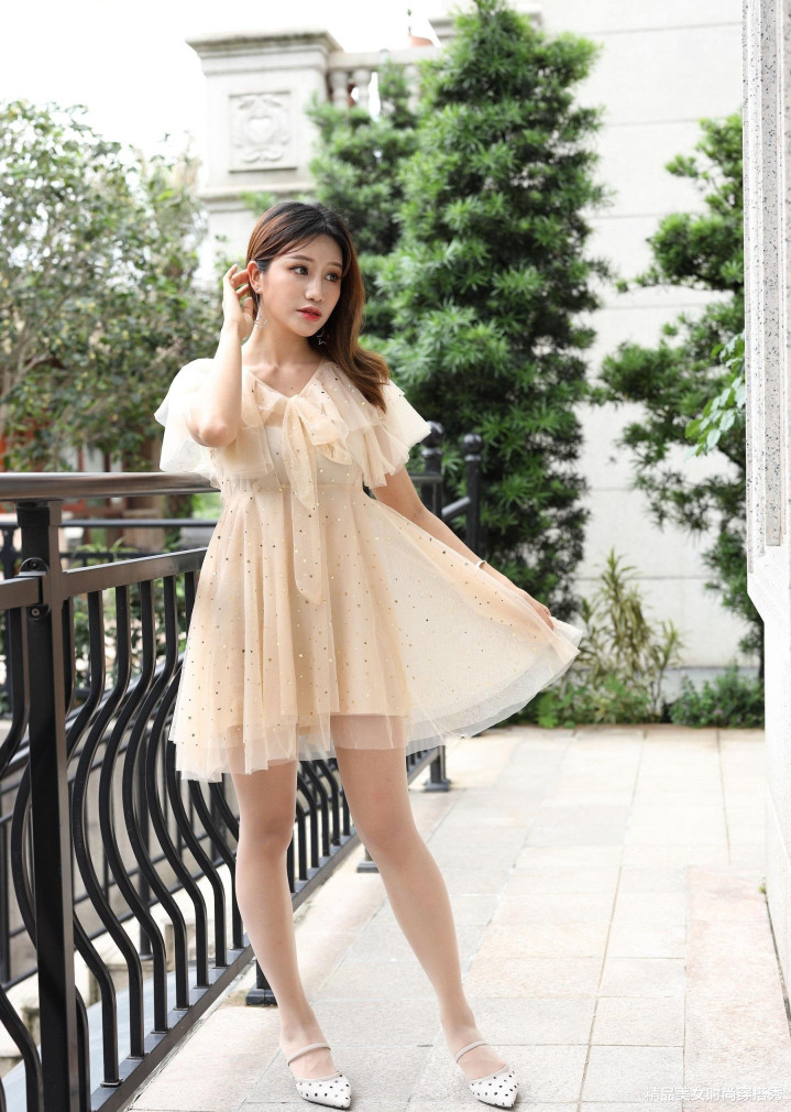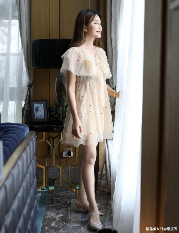👀这款纱裙采用轻盈的薄纱面料,点缀着闪亮的星月图案,仿佛夜空中最亮的星,让你在人群中熠熠生辉。V领设计搭配蝴蝶结系带,不仅拉长了颈部线条,更增添了几分甜美与浪漫。🎀